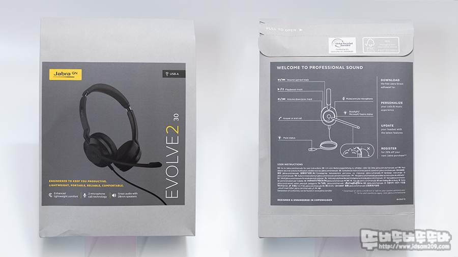 전면에는 제품 특징 가볍고 편안함, 2개의 마이크를 이용하 통화 기술, 28mm 스피커의 뛰어난 오디오와 모델명 Evolve2 30 그리고 패키지 뒷면 상단의 개봉 면에 글로벌 재활용 표준을 준수하는 패키지임을 인증하는 내용을 확인할 수 있습니다.
