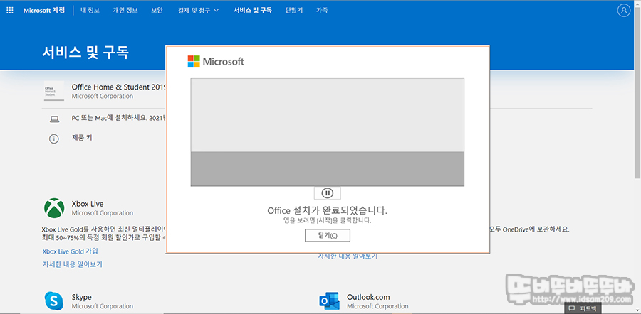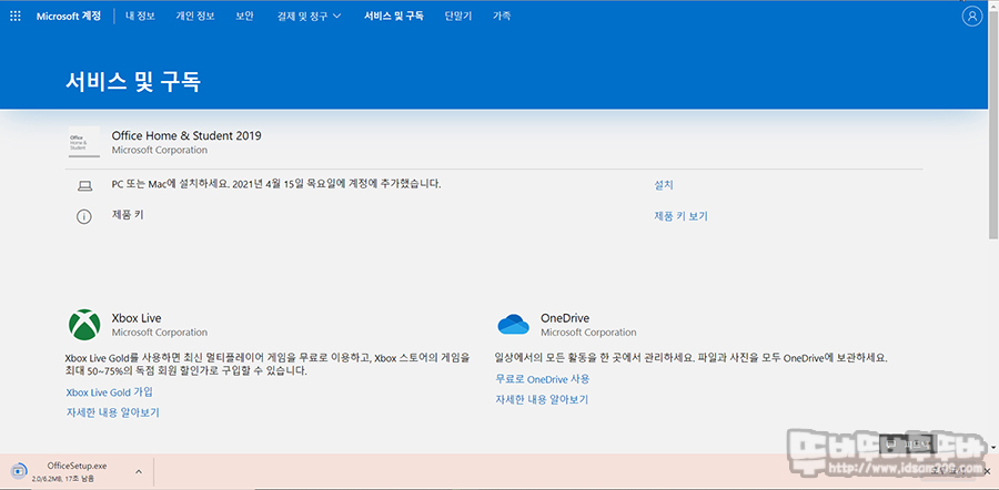 이렇게 접속하면 개인 개인 계정에 등록된 Home&Student 2019 소프트웨어를 다운로드할 수 있는 설치 버튼을 확인할 수 있습니다. 과감하게 "설치"를 클릭해주면 OfficeSetup.exe 파일이 다운로드되며 다운로드 이후 설치를 진행해주면 됩니다.