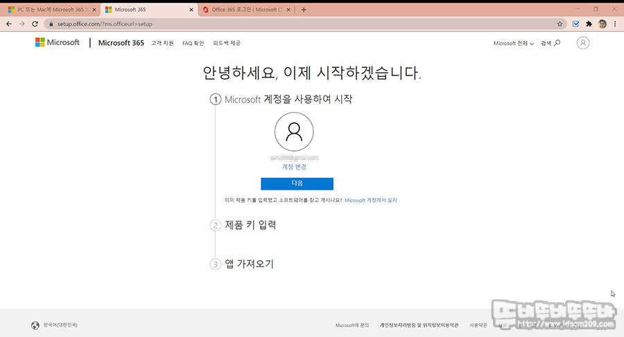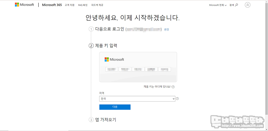 로그인 과정을 거치면 제품 키 입력 단계로 넘어가니 제공받은 제품 키의 스크래치 스티커 부분을 동전으로 긁어 벗겨내시고 혹 CD키 버전으로 전송받으신 분은 제공받은 키를 입력하시고 국가 설정 한국으로 선택 후 다음으로 진행합니다.