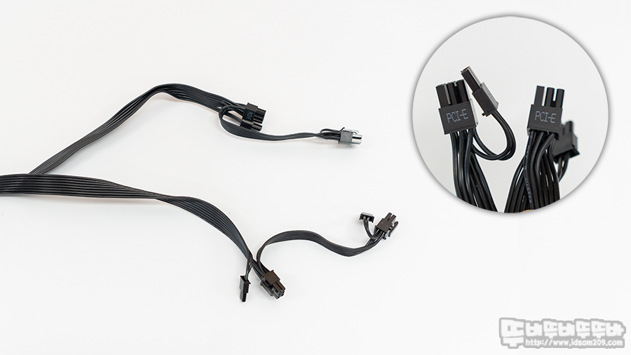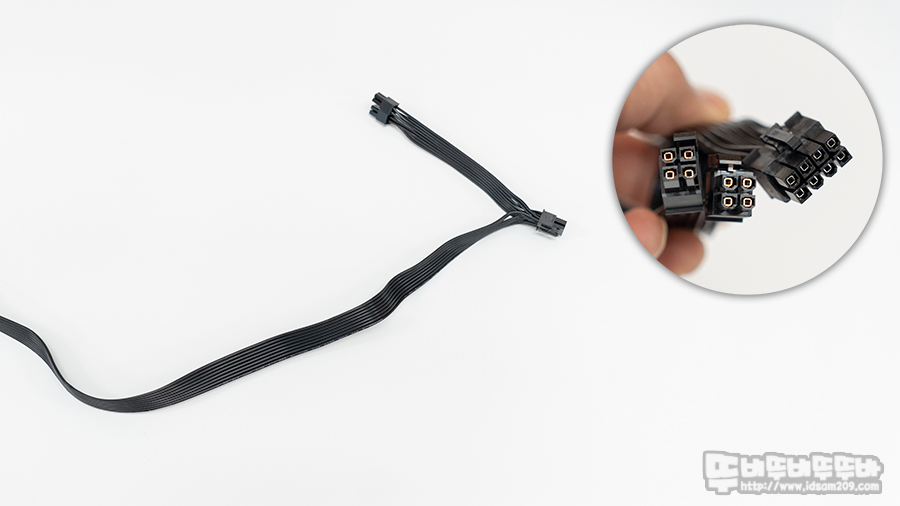 그래픽 카드의 보조 전원 케이블은 6+2핀 x 2개 구성의 450+150mm 길이로 2개의 케이블 총 4개의 커넥터를 제공하며