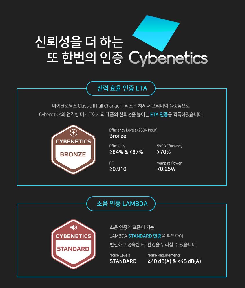 80Plus 230V EU 스탠다드 기준치 보다 최고 5% 이상의 80Plus 브론즈 등급의 성능을 보여주는 제품이며 여기에 Cybenetics 전력 효율 인증 ETA 브론즈와 소음 인증 LAMBDA 스탠다드 획득으로 성능 입증받았다고 합니다.