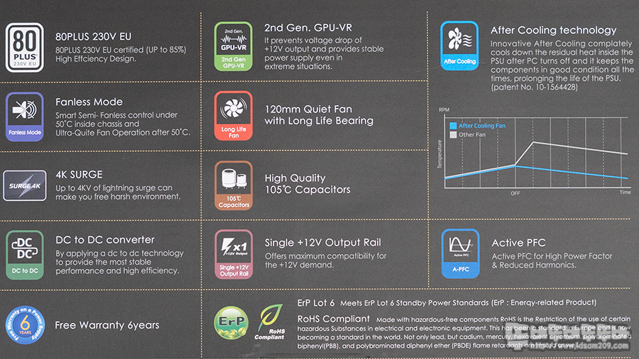 여기에 팬리스 모드 지원과 애프터 쿨링 모드 지원으로 제품의 내구성을 좋게 해주고 있으며 다양한 안정회로를 지원하고 있어 괜찮은 파워서플라이를 찾으시는 분들께 적극 추천드리며 리뷰를 마칩니다.