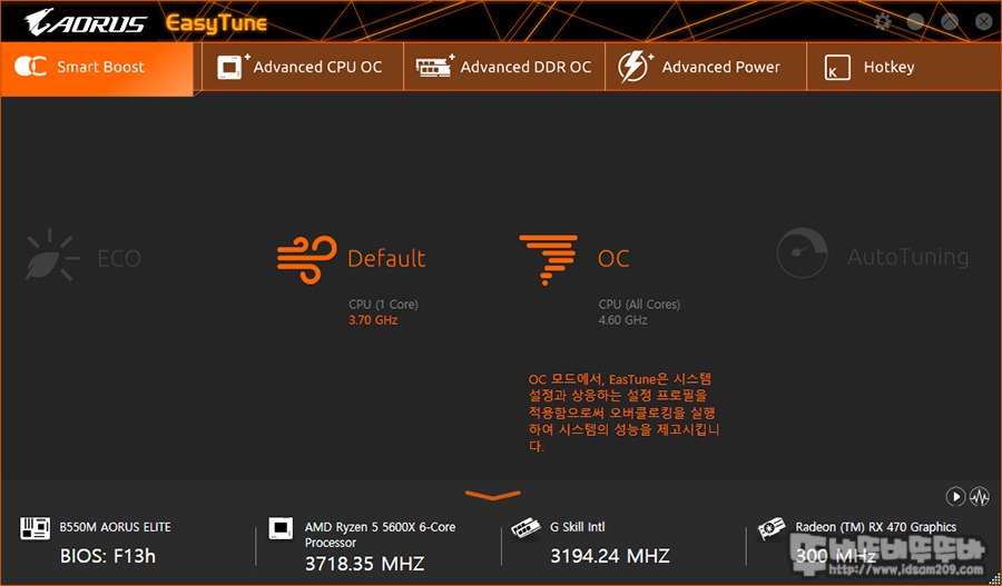 Easy Tune 메뉴에서는 CPU 오버와 메모리 오버 및 전압 세팅을 손쉽게 할 수 있는 메뉴로 사용자 역량에 따라 편리하게 시스템 오버를 할 수 있도록 메뉴 구성이 되어있습니다.