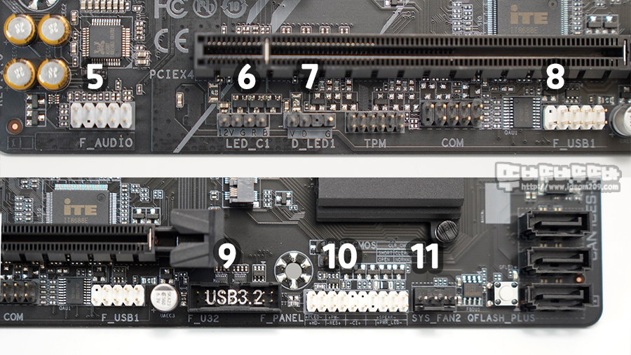 10) 전면 I/O, LED 인디케이터, 스피커 포트, 11) SYS 팬 4핀 커넥터_2 그리고 Q-Flash_Plus 버튼과 SATA 포트로 구성되어 있습니다.