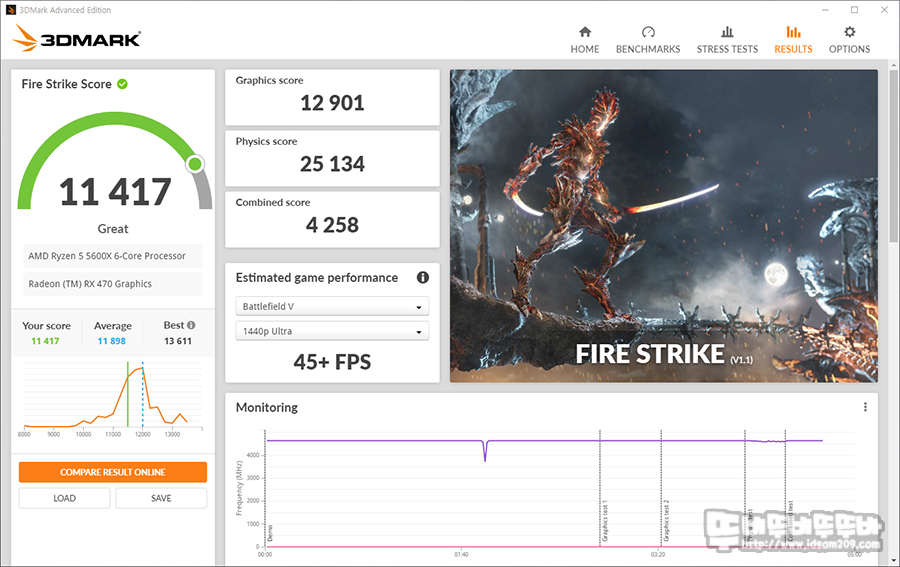 3D MARK - Fire Strike 테스트에서는 피지컬 스코어 25,134점, 컴바인 스코어 4,258점을 보여주며 그래픽카드 성능이 좋지 않은 관계로 참고만 해주시기 바랍니다.