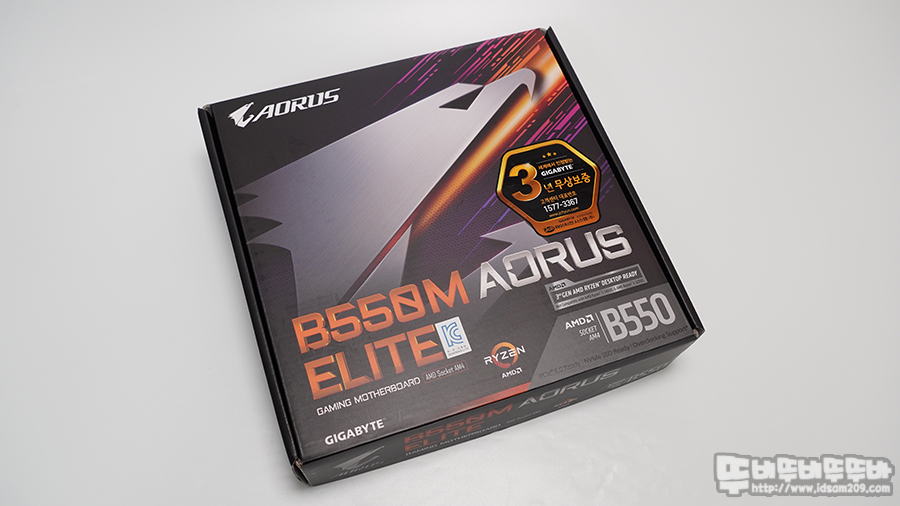 GIGABYTE B550M Aorus Elite 메인보드 패키지를 살펴보면 3년 무상 보증 스티커와 B550M Aorus Elite 모델명과