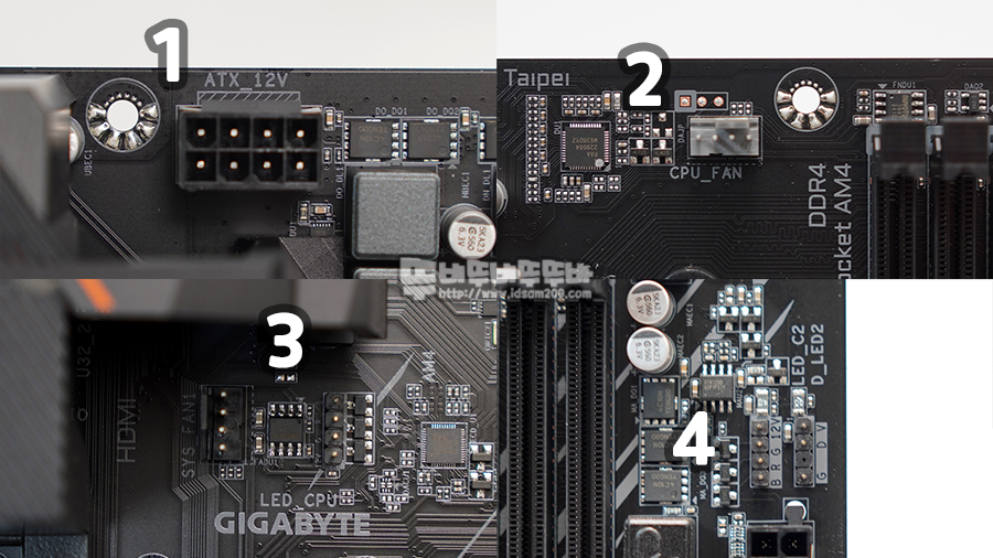 메인보드 상/하단에 +12V, +5V 헤더, 중앙에 +12V 헤더를 지원하고 있어 LED 튜닝 케이스 조립 시 활용도가 좋은 편입니다.