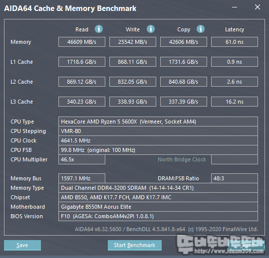 AIDA64 - Cache & Memory Benchmark 테스트에서는 CL14 3200MHz 클럭이 적용된 G.SKILL FLARE X 메모리 성능이 읽기 46,609 MB/s, 쓰기 25,542 MB/s, 복사 42,606 MB/s, 레이턴시 61.0 ns 성능을 보여주고 있습니다.
