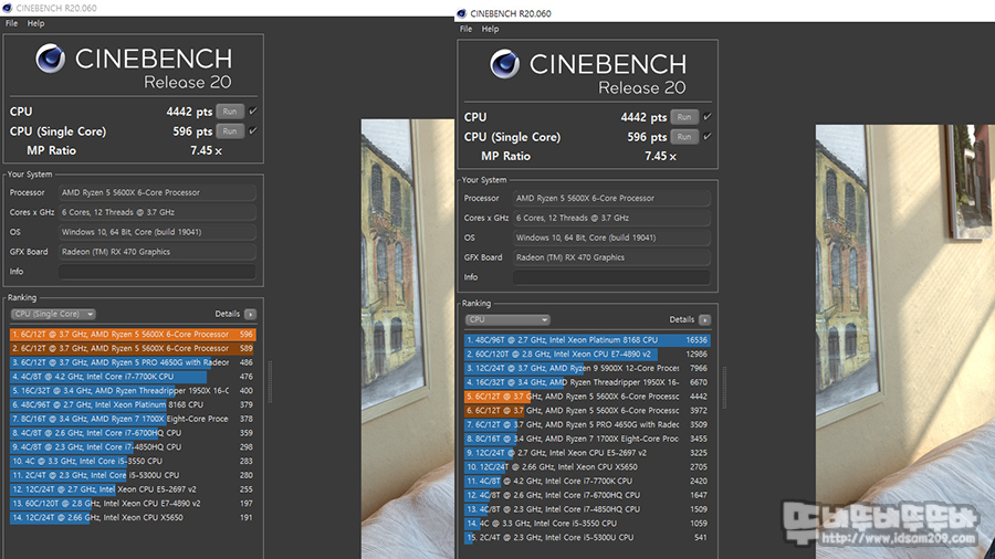 시네벤치에서는 싱글 코어 596 pts, 멀티 코어 4442 pts 성능을 보여주었습니다.