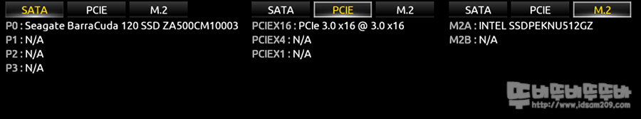 개인적으로 중앙부에 위치한 SATA, PCIE, M.2에 연결된 장치명을 상세하게 보여주는 부분이 맘에 드네요.