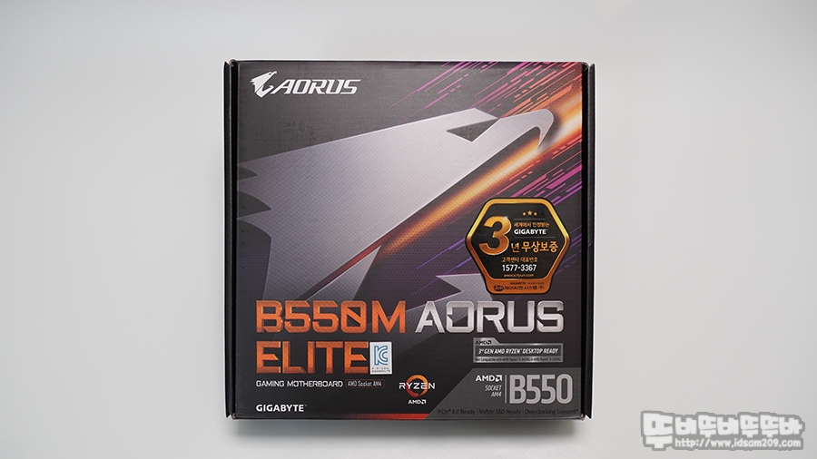 GIGABYTE B550M Aorus Elite 메인보드 패키지를 살펴보면 3년 무상 보증 스티커와 B550M Aorus Elite 모델명과