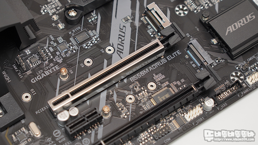 GIGABYTE B550M Aorus Elite 메인보드는 전원부 MOSFET 부분의 Aorus 로고가 인쇄된 히트싱크가 눈에 띄는데 PCIe 4.0을 지원하는 M.2_1 슬롯과 PCIe 4.0 x16 슬롯 부분에 금속 쉴드 처리가 되어있는 게 포인트입니다.