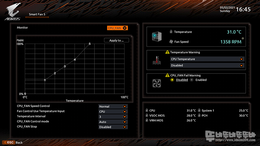 바이오스 화면에서는 시스템 상황에 대한 다양한 정보 및 설정이 가능하며 C-MOS 내의 Smart Fan5 메뉴를 통해 쿨링팬 컨트롤을 지원합니다.