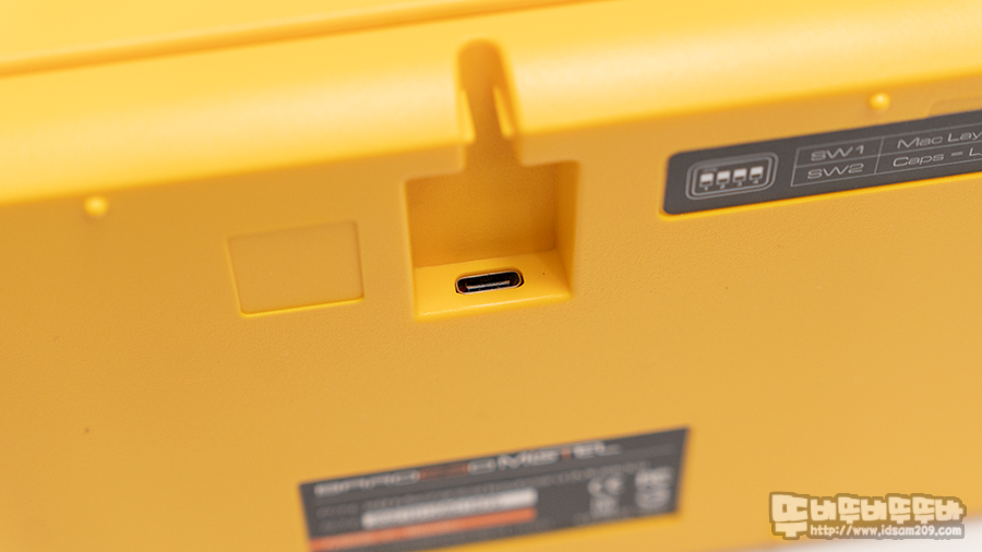 자체 경사 모델이긴 하지만 2단 높이 조절을 통해 최적의 타이핑 각도를 지원하고 있으며 키보드 중앙에 탈착이 가능한 USB-C 단자를 확인할 수 있으며 매립형으로 설계된 USB-C 단자 덕에 케이블 연결 후 USB-C 커넥터의 꺾임 방지가 가능하여 안심하고 사용할 수 있습니다.