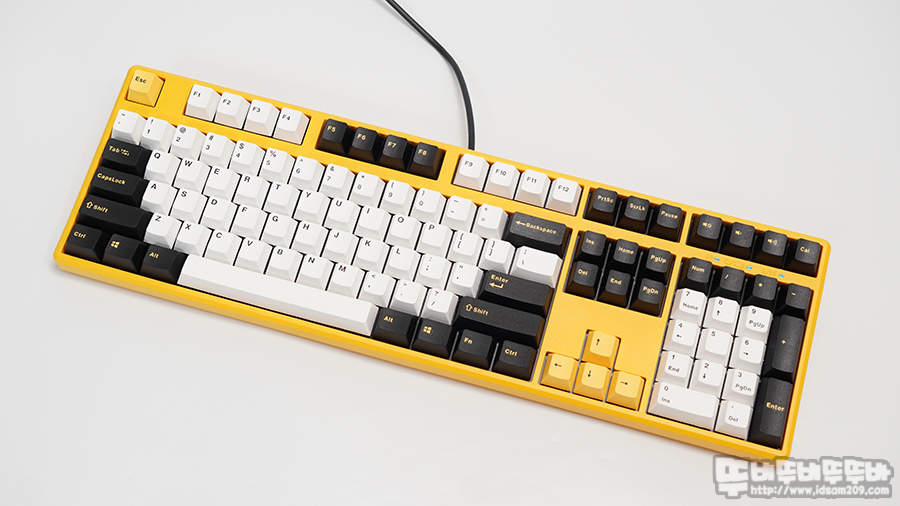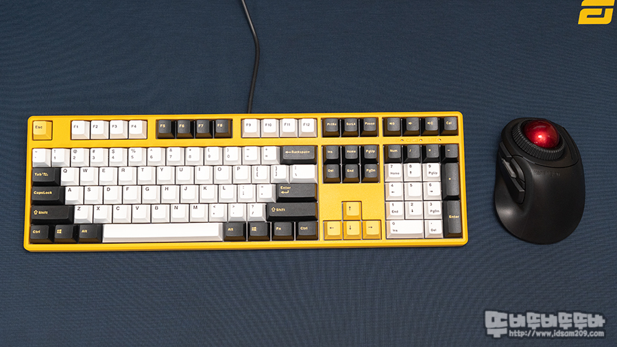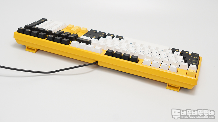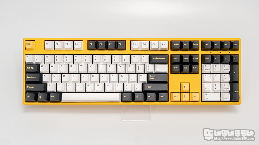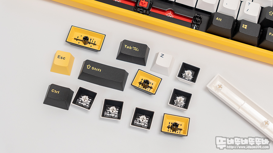 Mistel이 직접 디자인 후 생산하는 PBT 이중사출 키캡의 품질은 괜찮은 편이며 옐로우 하우징에 화이트/블랙 각인 키캡을 베이스열 그리고 블랙/옐로우 키캡을 모디열에 사용한 컬러 배합이 괜찮은 느낌을 줍니다.