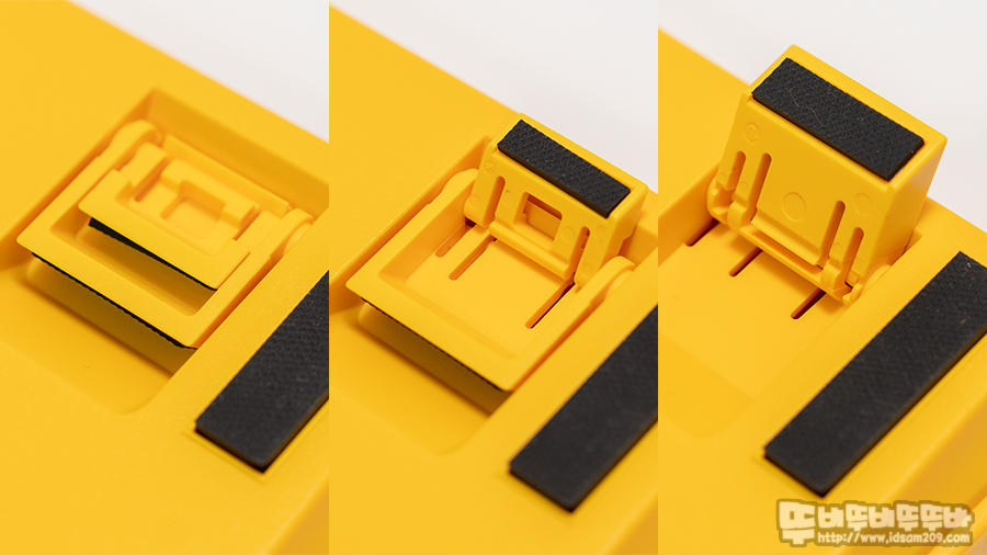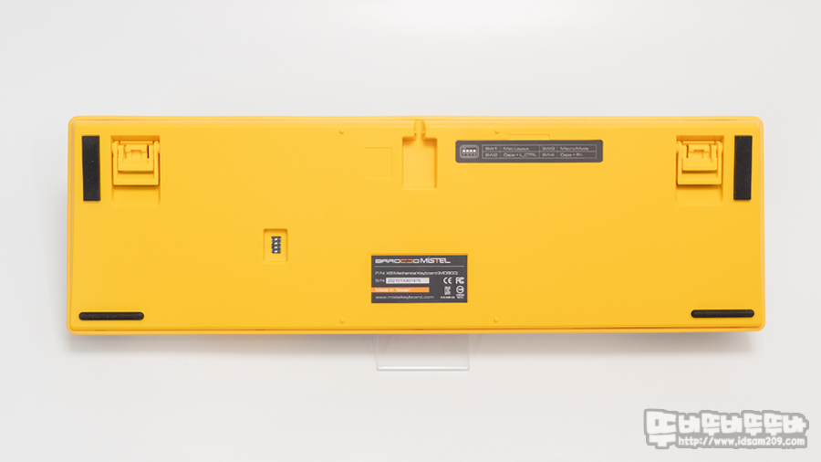 키보드 바닥면을 살펴보면 상단부에 세로로 하단부의 가로로 부착된 미끄럼 방지 패드와 기능 변경을 위한 DIP 스위치, 높이 조절 다리 모습을 확인할 수 있는데요.