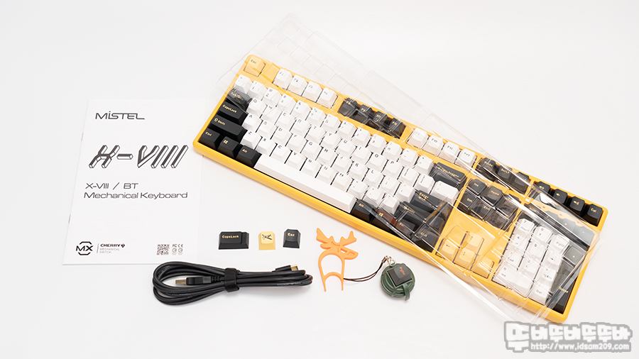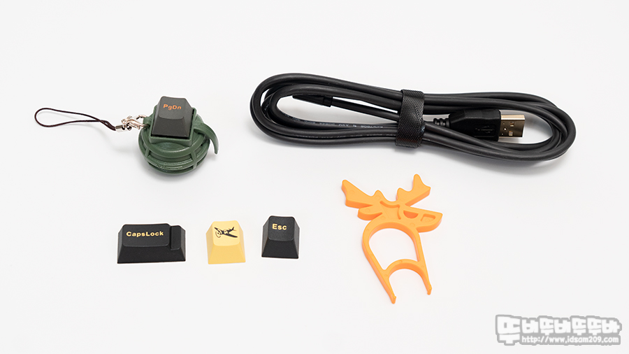 제품의 구성품으로는 사용설명서, X-VIII 범블비 키보드, 투명 재질의 더스트 커버, USB-C to A 케이블, 여분의 키캡, 키캡 리무버, 수류탄 디자인의 키 테스터로 구성되어 있습니다.