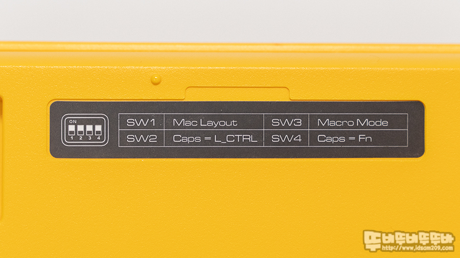 DIP 스위치 기능은 스위치 On 시 1) MAC OS 레이아웃, 2) Caps Lock = 왼쪽 Ctrl 키 위치 변경, 3) 매크로 모드, 4) Caps = Fn 키 위치 변경 기능을 지원하는 게 특징인데요.