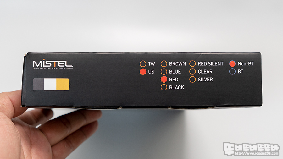 패키지 측면의 스티커로 부착된 제품 컬러 / 키캡 각인 : US / 스위치 : 체리 MX 레드 / 블루투스 지원 여부를 확인할 수 있는데요.
