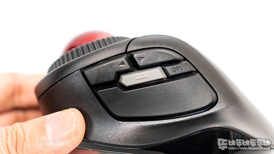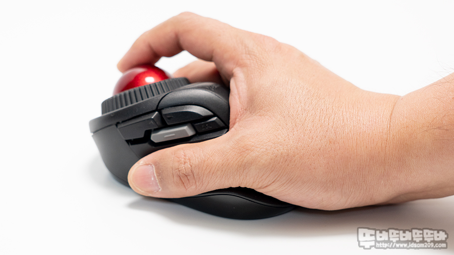 앞서 설명한 마우스 그립은 사이드 버튼을 담당하는 엄지손가락과 트랙볼을 컨트롤하는 검지 손가락의 간격이 멀지 않으며 사이드 부분에 날개 그립 부분에 엄지손가락을 올려놓고 사용할 수 있는 편안함을 제공합니다.