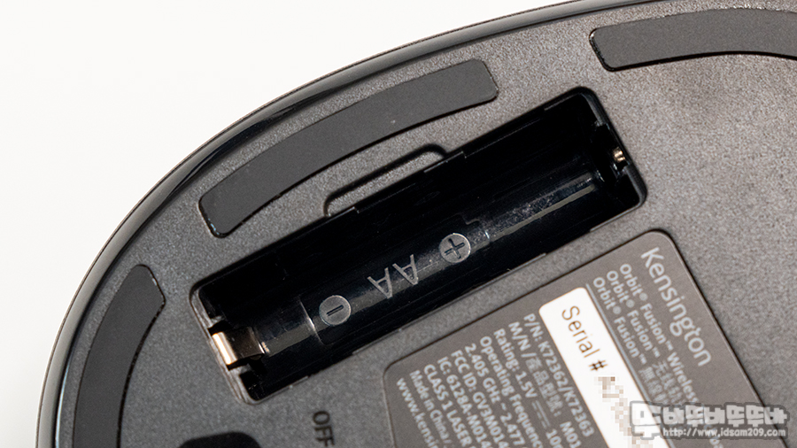 바닥면을 살펴보면 마우스 외곽을 따라 부착된 미끄럼 방지 패드, On/Off 전원 스위치, AA 건전지 소켓, 그리고 무선 리시버를 수납할 수 있는 소켓으로 구성되어있습니다.