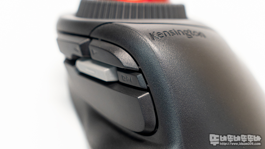 켄싱턴 트랙볼 마우스의 생명이라 할 수 있는 트랙볼 주변의 스크롤 다이얼 그리고 우측에 위치한 마우스 오른쪽 버튼 모습.