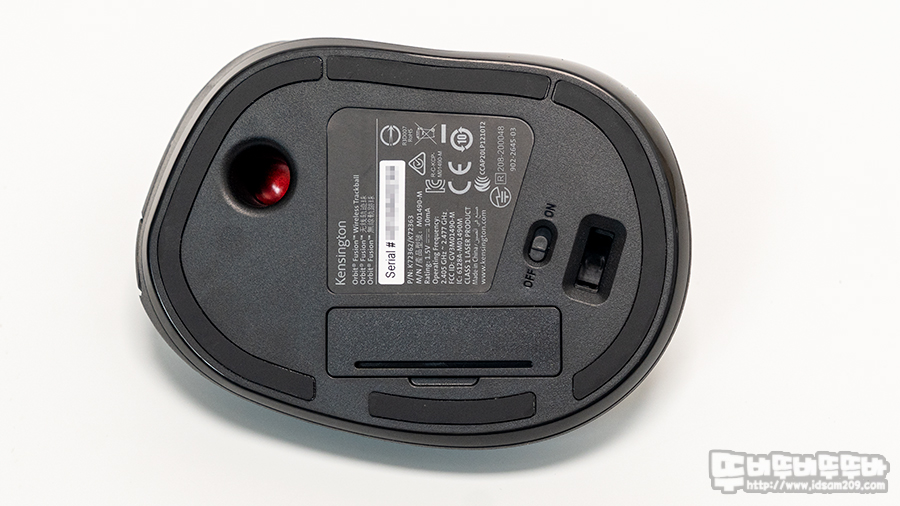 바닥면을 살펴보면 마우스 외곽을 따라 부착된 미끄럼 방지 패드, On/Off 전원 스위치, AA 건전지 소켓, 그리고 무선 리시버를 수납할 수 있는 소켓으로 구성되어있습니다.