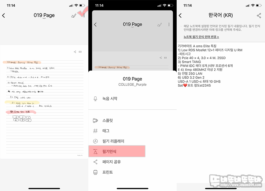 디지털로 전환된 메모 내용을 필기인식 기능을 이용하여 텍스트 변환이 가능하여 활용도가 좋은 편인데요.