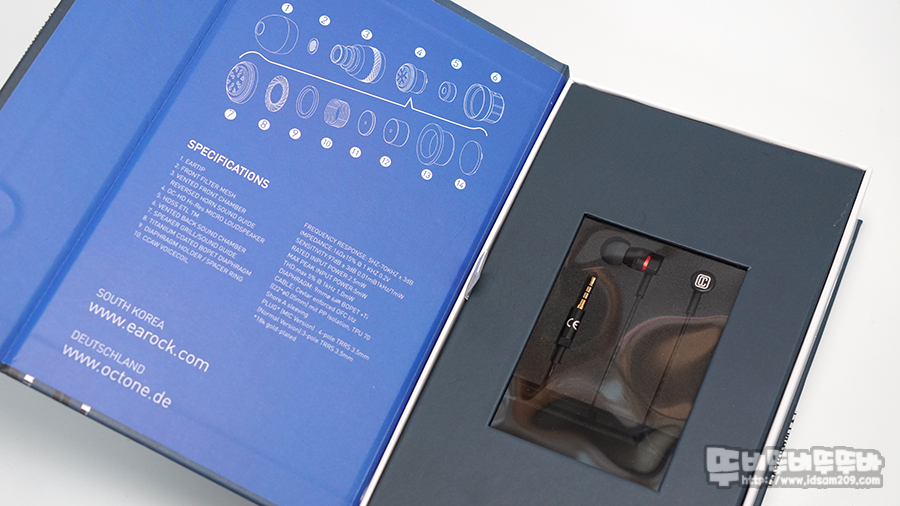 측면의 봉인 스티커를 제거하면 커버 형태로 오픈되는 패키지 모습을 확인할 수 있는 안쪽에는 OC-HD N50 드라이버 유닛 구조와 구성품 & 스펙 정보가 인쇄되어있습니다.