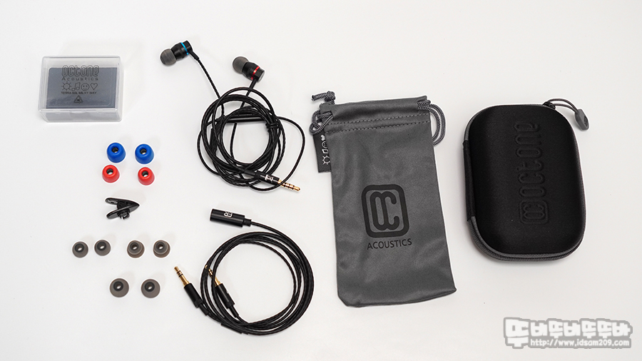 이어폰 본체, 실리콘 팁 L/M/S/Double 사이즈별 총 4쌍, 메모리 폼 팁 L(블루)/S(레드) 사이즈별 총 2쌍, 4극 to 3극 PC 연결용 케이블, 이어폰 보관용 천 파우치 / 하드케이스, 옷에 케이블을 고정하는 클립으로 구성되어있습니다.