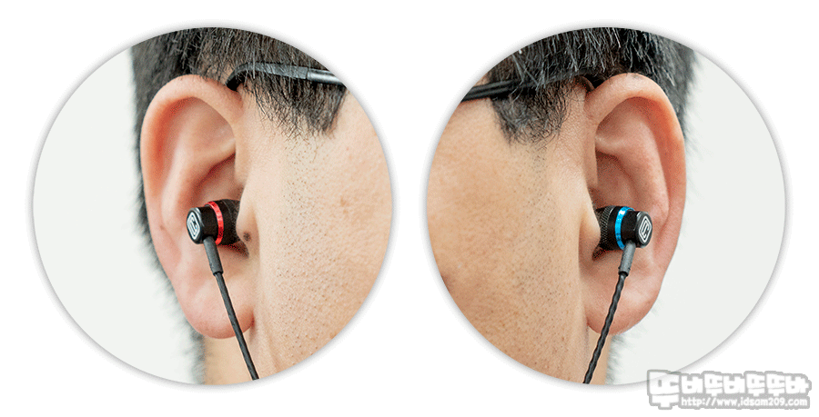 이어락 OC-G9 MK2 (이어락 옥톤) 이어폰 이어버드는 알루미늄 소재에 하우징 레드/블루 컬러로 포인트를 주고 있으며 이 컬러로 왼쪽/오른쪽을 구분하고 있습니다.