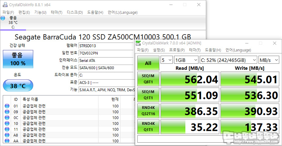 시게이트 바라쿠다 120 500GB SSD로 테스트 시 제품의 스펙인 순차 읽기 560MB/s, 순차 쓰기 540MB/s에 준하는 속도를 확인할 수 있었습니다.