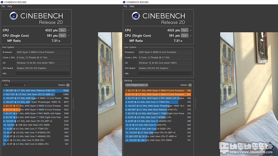 시네벤치에서는 싱글 코어 591 pts, 멀티 코어 4322 pts 성능을 보여주었습니다.