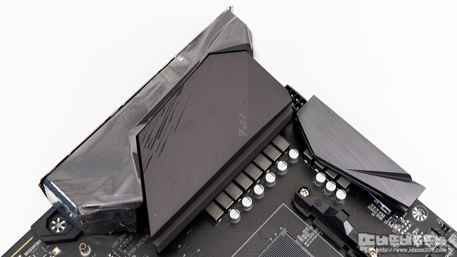 전원부 대형 히트싱크는 페이즈 구성은 초크 코일과 Low Ros MOSFETs을 커버하며 50A DrMOS를 사용한 10+2 위상 디지털 트윈 전원 설계로 최대 600A 전류를 안정적으로 공급합니다.
