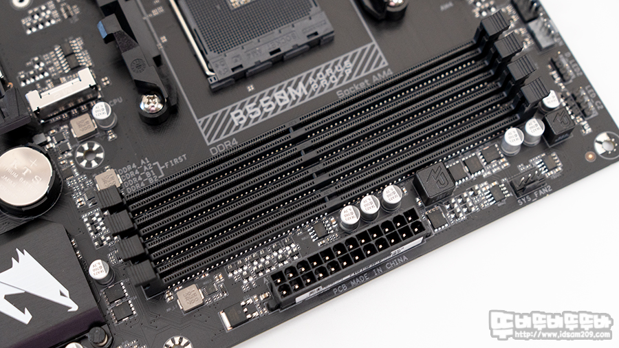 GIGABYTE B550M AORUS PRO-P 메인보드는 전원부 MOSFET 부분을 커버하는 두툼한 히트싱크가 눈에 띄는데 PCIe 4.0을 지원하는 M.2_1 슬롯의 블랙 컬러의 히트싱크와 PCIe 4.0 x16 슬롯 부분에 금속 쉴드 처리되어있는 게 포인트입니다.