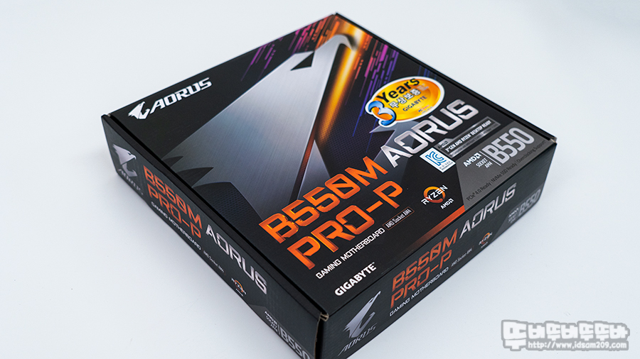 GIGABYTE B550M AORUS PRO-P 메인보드 패키지를 살펴보면 피씨디렉트에서 보증하는 3년 무상 보증 스티커와 B550M AORUS PRO-P 모델명과 라이젠 3세대 프로세서 지원, B550 칩셋 사용, PCIe 4.0, NVMe SSD, 오버클럭킹을 지원하는 문구를 확인할 수 있습니다.