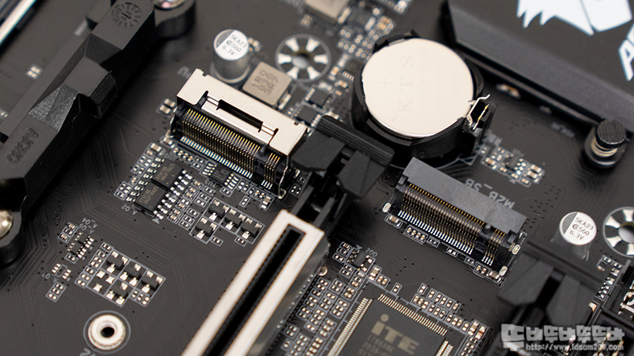 PCIe 4.0 x4을 지원하는 M.2_1 슬롯과 PCI-E 4.0 x16을 지원하는 VGA 슬롯에는 금속 느낌이 더해져 눈에 띄며 검정색 일반 슬롯은 PCIe 3.0 x4을 M.2_2 슬롯과 PCIe 3.0 x4을 지원하는 VGA 슬롯으로 구분되고 있습니다.