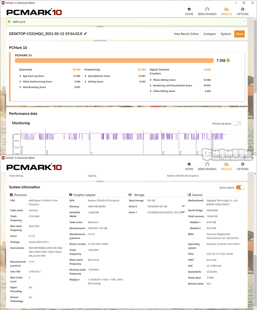 PC MARK 10 토털 스코어 7256점, Essentials 10,744점, Productivity 10,794점, Digital content Creation 8,939점의 성능을 보여주었습니다.