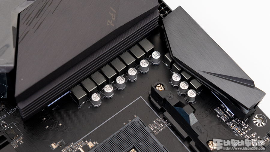 전원부 대형 히트싱크는 페이즈 구성은 초크 코일과 Low Ros MOSFETs을 커버하며 50A DrMOS를 사용한 10+2 위상 디지털 트윈 전원 설계로 최대 600A 전류를 안정적으로 공급합니다.