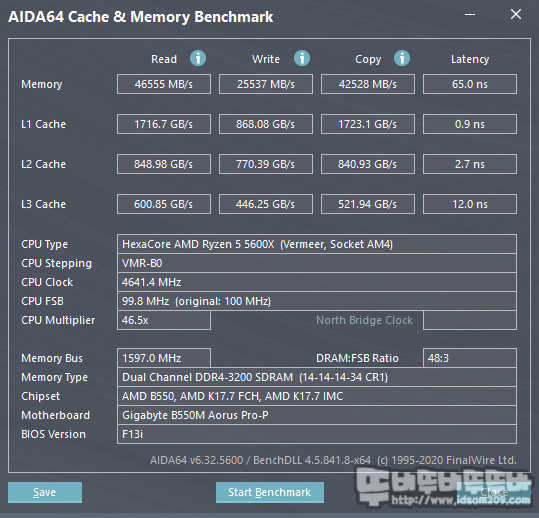 AIDA64 - Cache & Memory Benchmark 테스트에서는 CL14 3200 MHz 클럭이 적용된 G.SKILL FLARE X 메모리 성능이 읽기 46,555 MB/s, 쓰기 25,537 MB/s, 복사 42,528 MB/s, 레이턴시 65.0 ns 성능을 보여주고 있습니다.