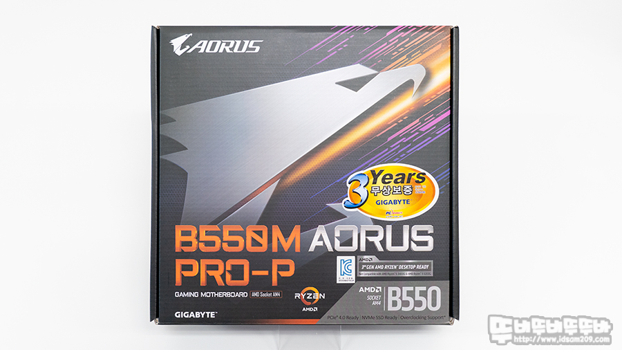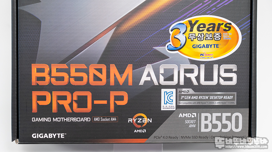 GIGABYTE B550M AORUS PRO-P 메인보드 패키지를 살펴보면 피씨디렉트에서 보증하는 3년 무상 보증 스티커와 B550M AORUS PRO-P 모델명과 라이젠 3세대 프로세서 지원, B550 칩셋 사용, PCIe 4.0, NVMe SSD, 오버클럭킹을 지원하는 문구를 확인할 수 있습니다.