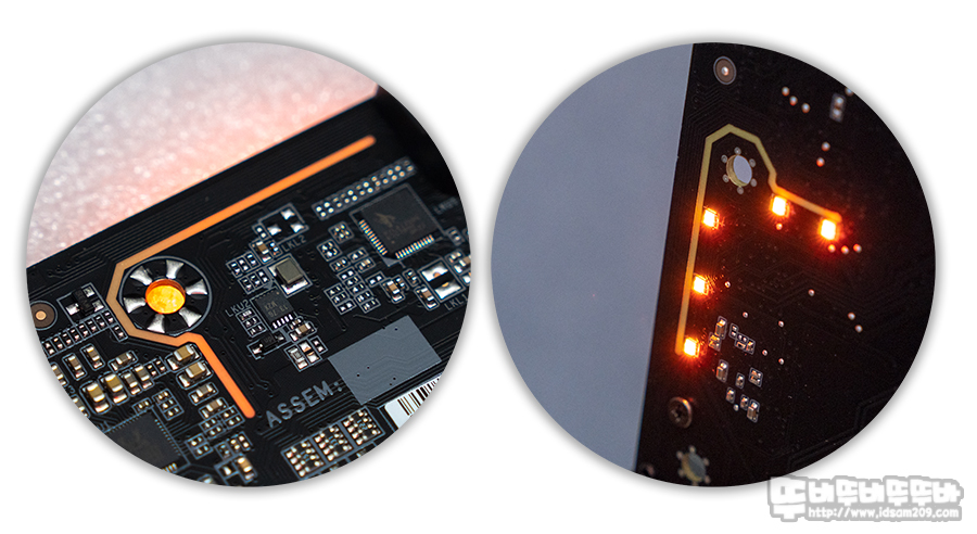 오디오 노이즈 가드 부분에는 메인보드에 전원공급 시 LED 라이팅으로 PCB 상단에 LED가 투영됩니다.