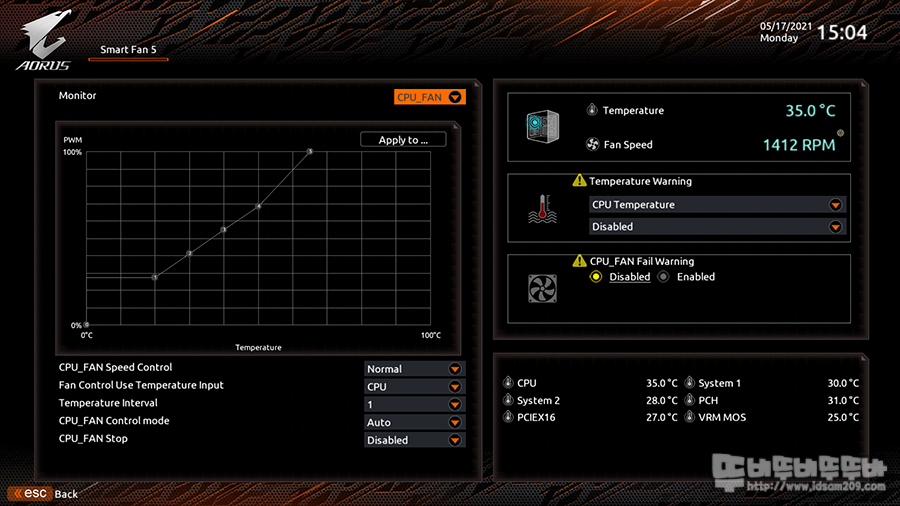 바이오스 화면에서는 시스템 상황에 대한 다양한 정보 및 설정이 가능하며 C-MOS 내의 Smart Fan5 메뉴를 통해 쿨링팬 컨트롤을 지원합니다.