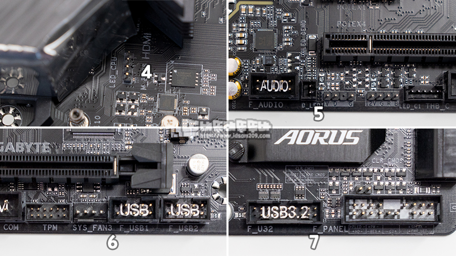 4) +12V RGB 헤더, 5) 전면 오디오 포트, +5V ARGB 헤더, +12V RGB 헤더, 썬더볼트 헤더 6) SYS_FAN 3, 전면 USB 2.0 포트 7) 전면 USB 3.2 Gen 1 포트, 전면 I/O로 구성되어 있습니다.