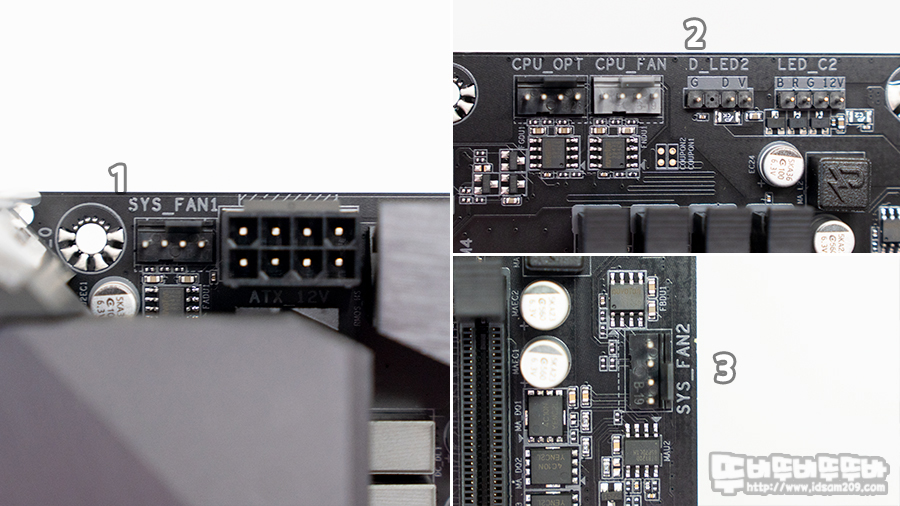 1) SYS_FAN 1, 8핀 CPU 보조 전원, 2) CPU_OPT, CPU_FAN, +5V ARGB 헤더, +12V RGB 헤더 3) SYS_FAN 2