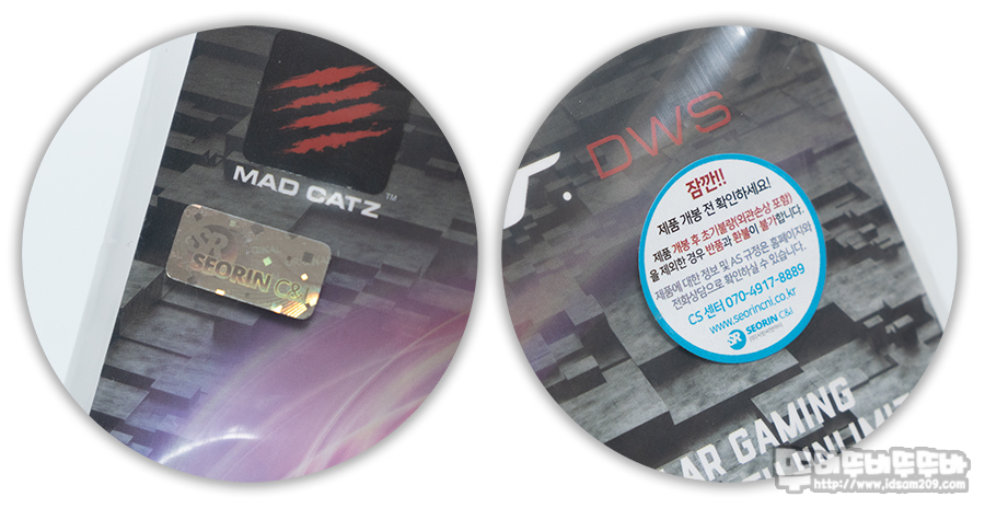 MadCatz R.A.T DWS 듀얼 무선 마우스 패키지를 감싸고 있는 봉인 비닐에는 유통사 서린씨앤아이의 정품인증 홀로그램 스티커와 개봉 후 반품 및 환불이 불가하다는 내용 그리고 고객지원센터 전화번호가 적혀있으니 잘 보관해주시기 바랍니다.