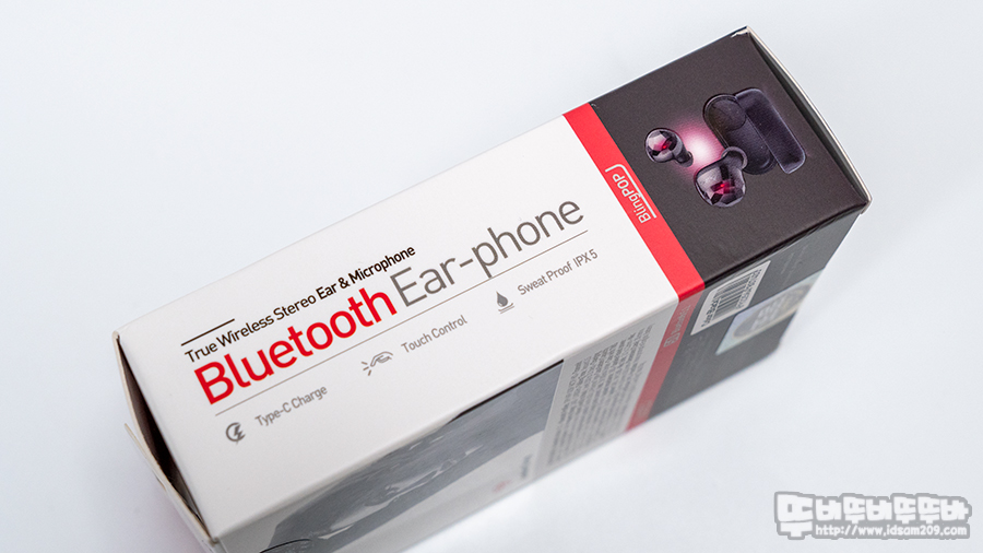 패키지 전면에는 블루투스 5.1, USB-C 단자, 4.5g 초경량, 24시간 재생 (최저볼륨 사용 시) 그리고 IPX5 생활 방수 지원 등 포인트 정보를 다루고 있고요.