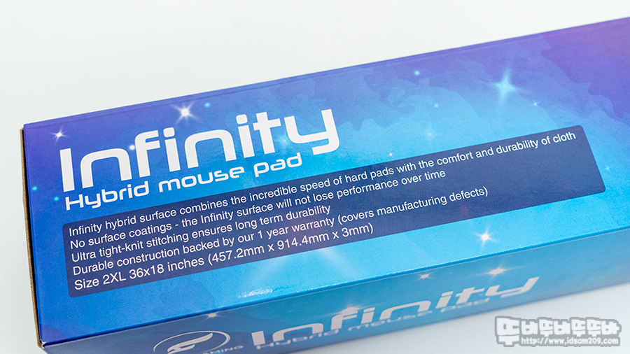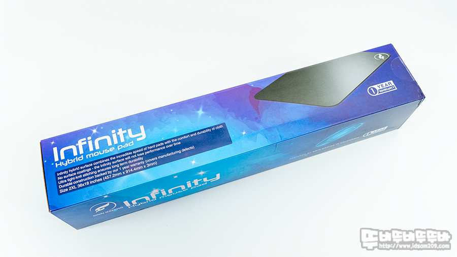 영문으로 인피니티 하이브리드 마우스 패드 표면 X, Y 방향의 균일함과 좋은 내구성, 엣지 부분의 오버로크 적용, 보증기간 1년 ( 이 부분은 대부분 초기 불량에만 해당이 될 듯) 그리고 사이즈 정보를 2XL 모델의 사이즈 914 x 457 x 3mm를 표기하고 있습니다.