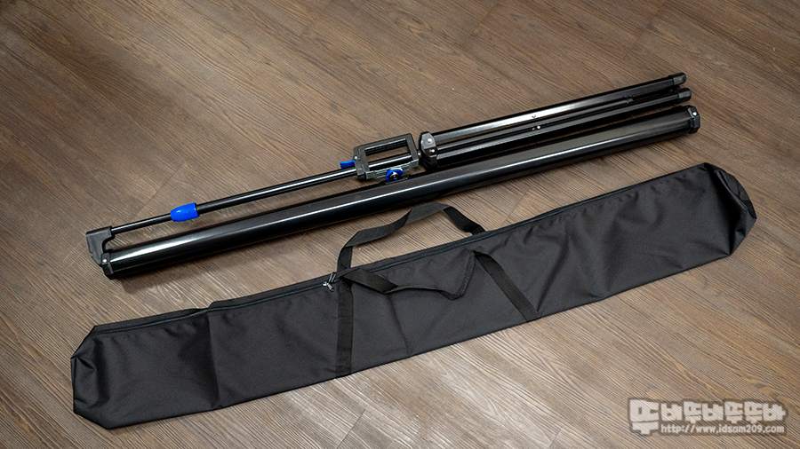 태리 스탠드 일체형 반자동 족자 빔프로젝터 스크린과 60인치 보관 가방 모습.