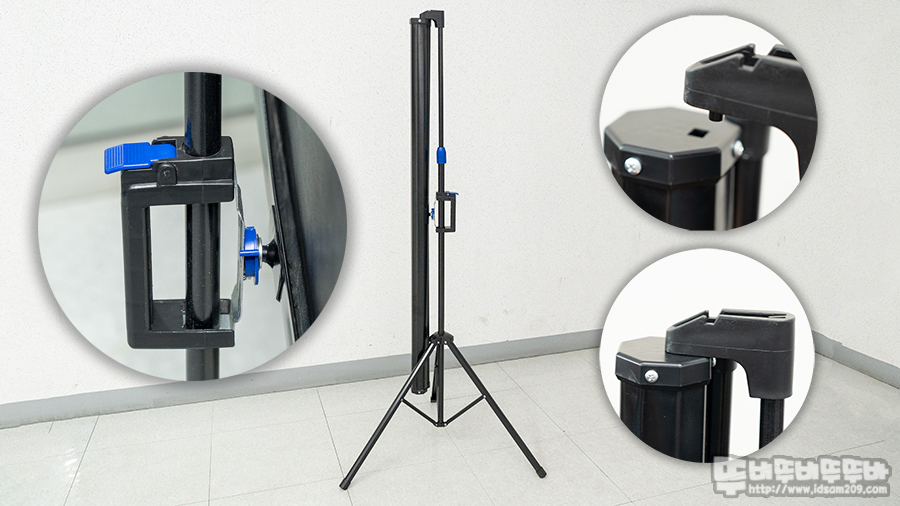 중앙 손잡이 부분의 위쪽에 파란 고정 클립을 이용하여 풀고 고정하는 방식으로 사용하게 되며 이동 시에 손잡이로 활용하게 됩니다.